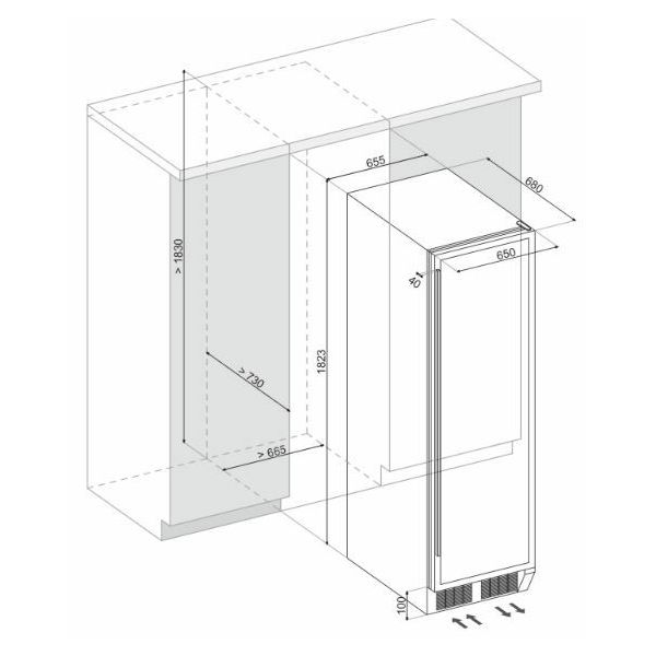 DX-194.490BK Ekskluzivni ugradbeni hladnjak Dinamički kompresorski Boca (0,75 lit bordeaux): 194 Komora: 1 Temperatura hlađenja: 5 °C - 22 °C Kućište: crno Staklena vrata sa UV filterom Reverzibilna vrata Zaključavanje Police: drvene Svjetlo Odmrzavanje: automatsko Ugljeni filter Zaštita od smrzavanja Kapacitet: 490 l Visina: 1835 mm Širina: 655 mm Dubina: 680 mm Plin za hlađenje: R600a Potrošnja: 318 kWh/god Energetska klasa: D Klimatska klasa: N, SN, ST Nivo buke: 39 dB Netto težina: 108 kg