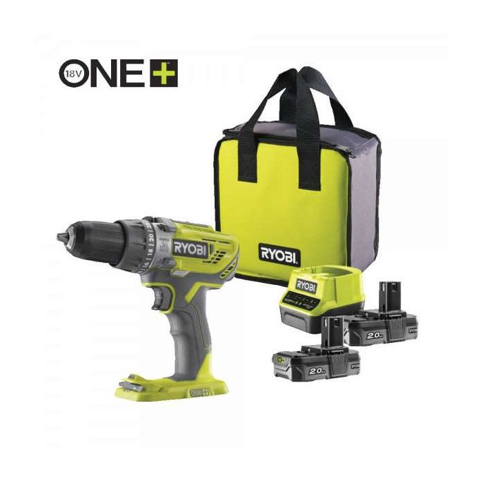 Ryobi R18PD3-220S Aku udarna bušilica-odvijač 18V ONE+ Glava: 13 mm 2 brzine 0-500 / 0-1800/min Max. okretni moment 50 Nm Max. bušenje u drvu 38 mm / u metalu 13 mm / u zidu 13 mm LED svjetlo 2 x Li-Ion akumulator 2,0Ah Punjač Meka torba