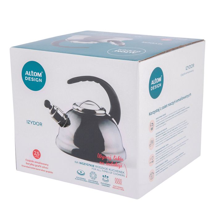 Zapremnina 2,5 l Promjer 23 cm Visina 21 cm Kuhalo za vodu postat će pouzdan pomagač u svakom domu. Izrađeno od visokokvalitetnog ugljičnog čelika osigurava trajnost. Premaz s dva sloja emajla, iznutra i izvana, osigurava sigurnost i otpornost na oštećenja. Udobna bakelitna ručka jamči siguran hvat. Poklopac koji se otvara olakšava ulijevanje vode. Zviždaljka obavještava o kipućoj vodi.
