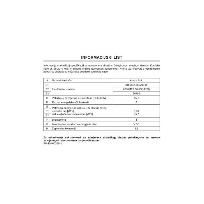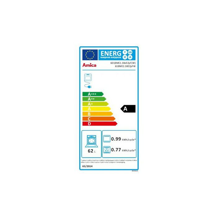 Amica štednjak 60 cm; 3+1 kombinirani električna pećnica sa 9 funkcija; Dodaci: Električno paljenje ploče za kuhanje integrirano u tipku; električni grill (2000 W); ladica koja se izvlači; sigurnosni ventil za plamen; troslojno staklo, parno čišćenje, ventilator, recepti na vratima Ploča za kuhanje: - 4 cm Eco pomoćni plamenik (1,5 kW); - 6,5 cm Eco srednji plamenik (1.75 kW); - 9 cm Eco veliki plamenik (3 kW); - 18 cm standardna električna ploča (1.2 kW) Kapacitet pećnice: 62 l; Energetski razred: A; Dimenzije: 85x60x60 cm; Boja: bijela