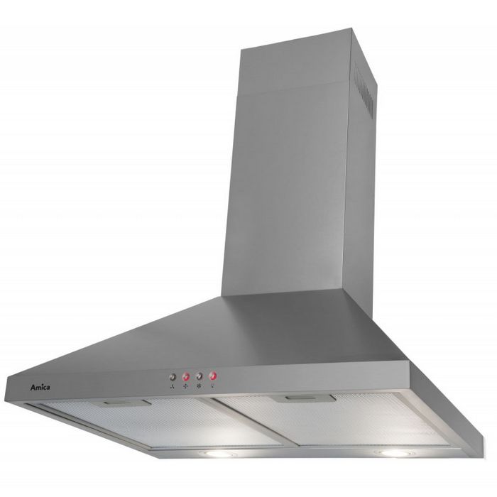 Amica kaminska napa 60 cm; 2 LED svjetla (2X1,5W); 3 brzine; 1 motor; Snaga izvlačenja: 470 (m³/h); Glasnoća pri max brzini: 63 db; 2 aluminijska filtera za masnoću; Boja: inox