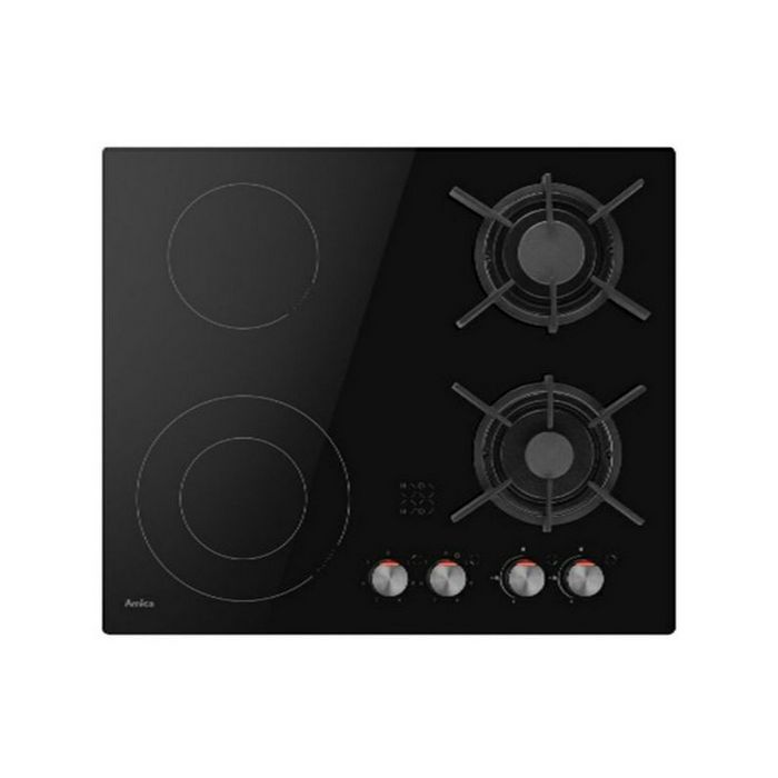 Amica VG 6022Kombinirana ploča2 x struja + 2 x plinCrnaElektrično paljenje plamenika integrirano u tipkeSigurnosni ventil za plamenNosači posuda od lijevanog željezaPloča:- jednostruka zona 14 cm (1.2kW)- dvostruka zona 12/21 cm (0.75 / 2.2 kW)- 4.6 cm mali plamenik 1.0 kW- 6.9 cm srednji plamenik 1.8 kWInox okvirDimenzije: 592 x 87 x 522 mm