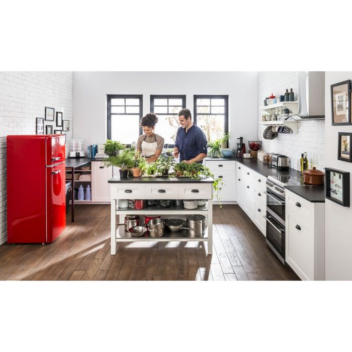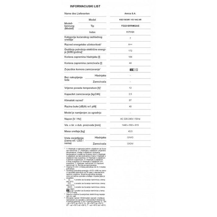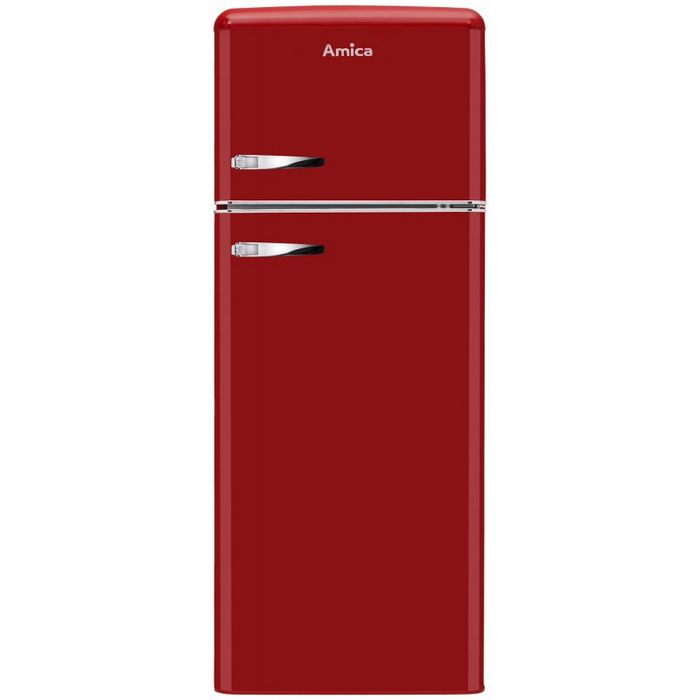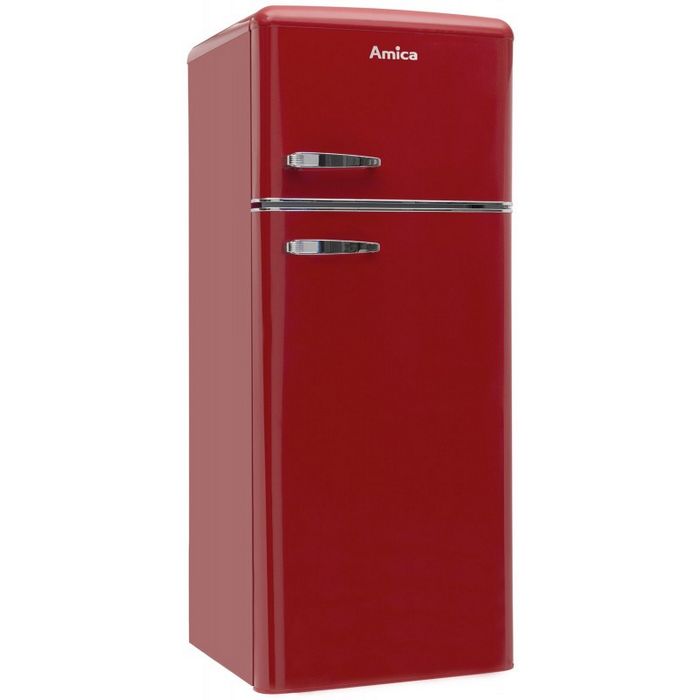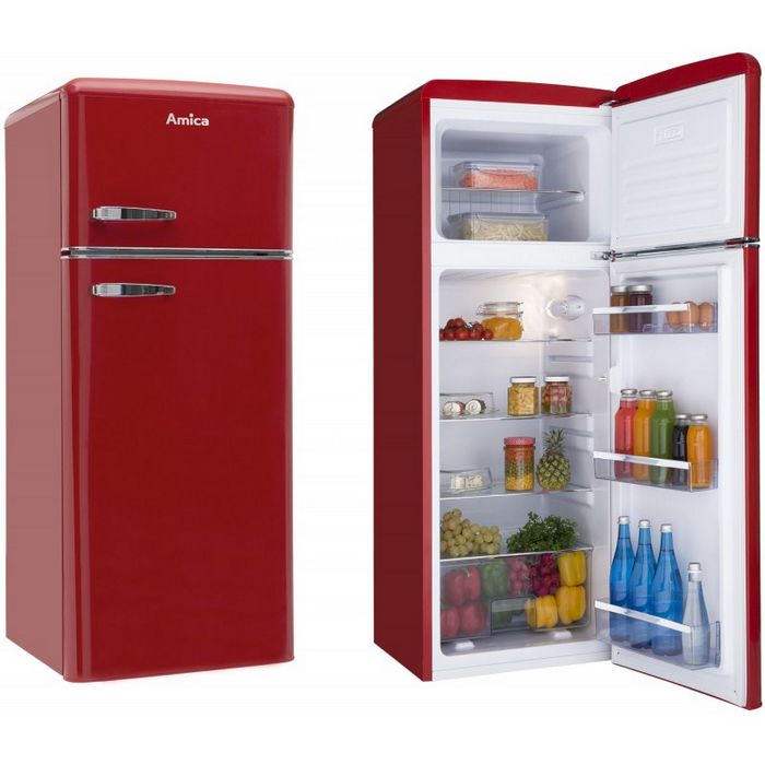 Amica retro kombinirani hladnjakUkupni kapacitet: 210 l;Netto kapacitet hladnjaka: 164 l;Netto kapacitet zamrzivača: 44 l;Energetski razred: A++;Kapacitet zamrzavanja: 5 kg/24h;Pohrana namirnica kod nestanka struje: 16 sati;Godišnja potrošnja: 172 kWh; Razina buke: 40 dB;Broj vrata - 2 / Broj polica - 4 / Broj ladica u zamrzivaču - 2 /Antibakterijski sistem / Automatsko odleđivanje /Držač jaja / Ladica za voće i povrćeDimenzije: 144 x 55 x 61,5 cm