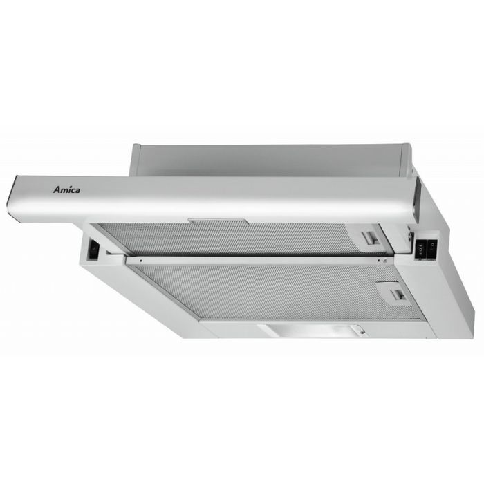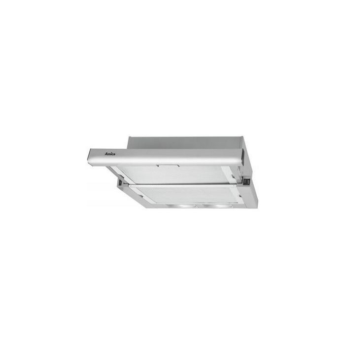 Amica teleskopska napa 60 cm; 2 LED svjetla (4W); 3 brzine; 1 motor; Snaga izvlačenja: 260 (m³/h); Glasnoća pri max brzini: 59 db; 2 aluminijska filtera za masnoću; Boja: inox