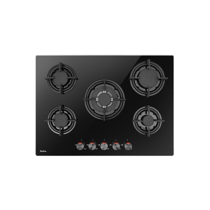 Amica plinska ploča za kuhanje sa tipkam;keramika; 5 zona za kuhanjeDodaci:Electric gas ignition; sigurnosni ventil za plamen;rešetke od lijevanog željeza; posebni plamenik za WOK;Ploča:– plamenik 5 cm (1 kW);– plamenik 7.5 cm (1.75 kW) x 2;– plamenik 10 cm (3 kW);– plamenik WOK 13 cm (3.5kW);Dimenzije: 700 x 510 mm