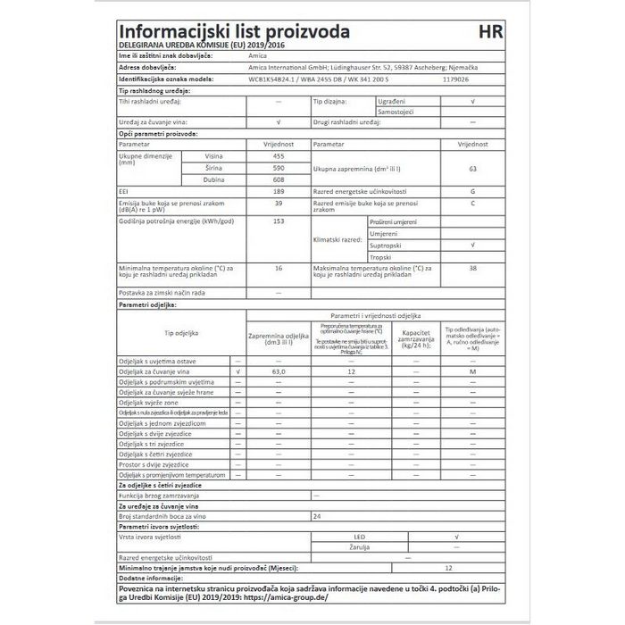 24 boca / 63 lit Crna vrata Ugradbeni u element Reverzibilna vrata UV filler,LED rasvjeta 1 zone, drvene police Temperatura: 5-20 °C Ener.klasa: A, ST klimatska kl. Potrošnja: 140 kWh/god Dimenzije (cm): 45,5(v) x 59,5(š) x 60(d) Nivo buke: 39dB