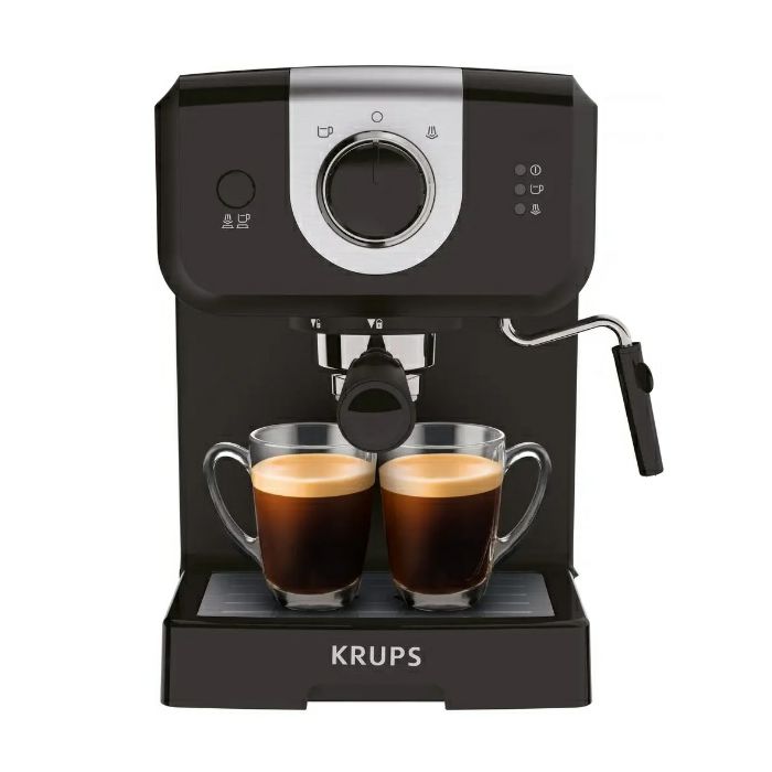 Krups XP320830 Aparat za kavu Ručni espresso uređaj Tlak: 15 bara Aluminijski grijač za brže zagrijavanje Thermoblock sustav s novom oblogom za idealan espresso i manje kamenca Parna cjevčica za savršeni espresso Filter za jednu ili dvije kave Izbornik za odabir: kava ili para Tipka za temperaturu 130°C za paru i 90°C za kavu Nastavak za savrešno zbijanje kave za espresso Žlica za doziranje Odvojivi spremnik za vodu: 1.5 l Posuda za kapljevinu Ručno isključivanje