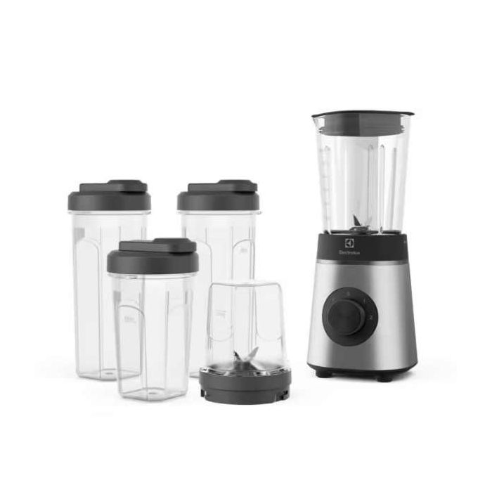 Electrolux E4CB1-6ST Electrolux blender Boja: nehrđajući čelik Stakleni vrč od 0,6 l 2 x 600 ml + 1 x 300 ml Mix+Go boce bez SAN BPA Okretni prekidač s 2 brzine i funkcijom Pulse 4 oštrice od nehrđajućeg čelika