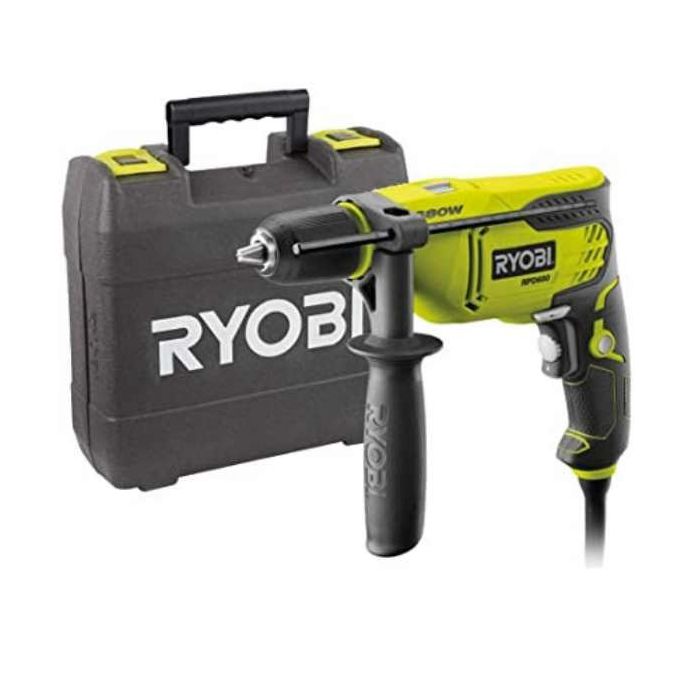 Ryobi RPD680-K Udarna bušilica: 680 W Brzostezna glava: 10 mm Bušenje u drvu 32 mm, u željezu 13 mm, u zidu 16 mm Masa: 3,76 kg Dodatna ručka Graničnik dubine Kofer