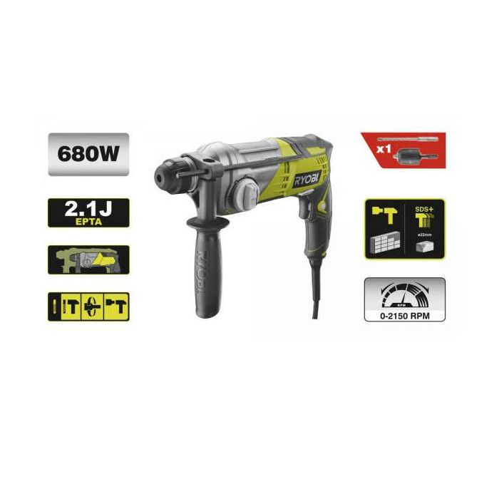 Ryobi RSDS680-K Bušači čekić 680 W Prihvat sds-plus Bušenje u zidu do 22 mm Snaga udarca 2,1J Masa: 2,72 kg Kofer