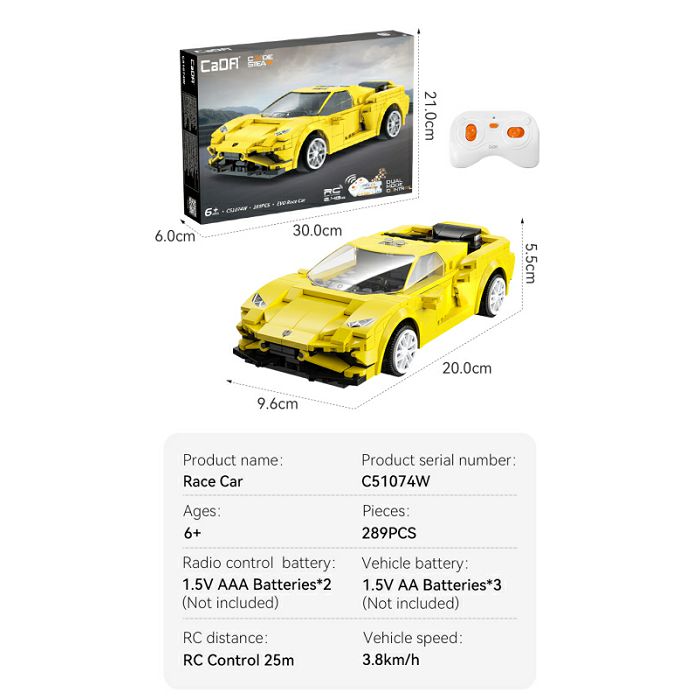 CaDA EVO trkaći automobil – žuti (C51074W) • 1:20 Brz i atraktivan RC trkaći automobil u mjerilu 1:20 s 289 dijelova . Model ima dvostruko upravljanje – 2,4 GHz daljinsko upravljanje i CaDA SMART aplikaciju (načini rada: daljinski, putanja, žiroskop, Scratch-programiranje), tako da je odličan izbor za prvo RC iskustvo i STEM učenje.