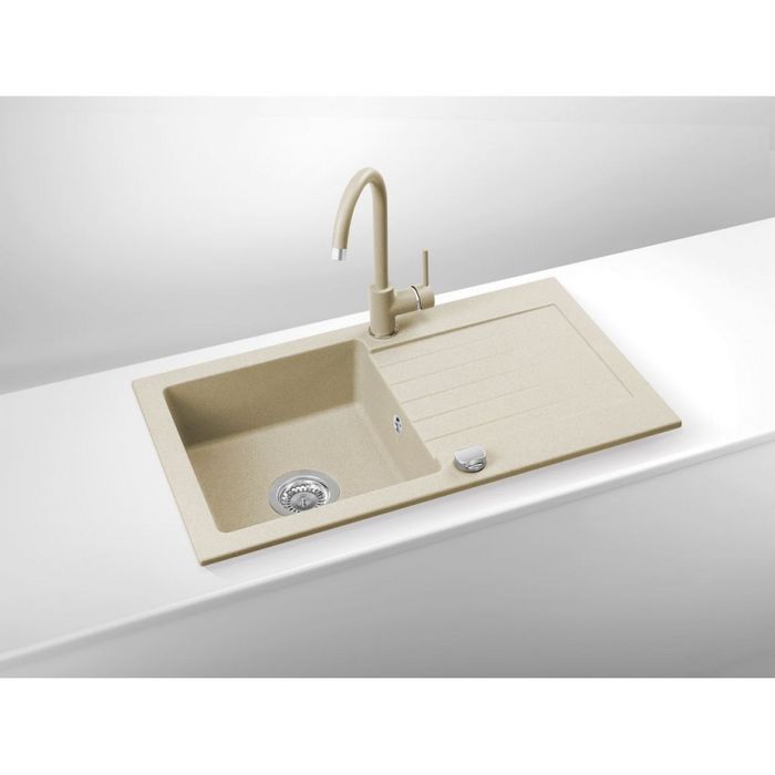 Komplet granitnog sudopera i slavine u boji pijeska unosi dašak elegancije u svaku kuhinju zahvaljujući svom atraktivnom izgledu Sudoper: način montaže: klasičan dimenzije (D x Š x D): 76 x 44 x 15 cm veličina elementa: 60 cm promjer odvoda: 3,5'' izvedba: reverzibilno (okretna) uključeno: sifon – skočni ekscentar (odvod se otvara i zatvara uz pomoć gumba) Slavina: oblik: s jednom ručkom materijal: u boji način montaže: stojeći visina: 35,5 cm duljina do odvoda: 17,3 cm klasa protoka: Z – 9 l/min razina buke (dB): I – ispod 20 Jamstvo: 10 godina