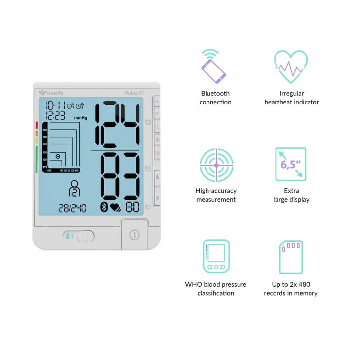Dovoljno velik i jasan zaslon s pametnim funkcijama Tlakomjer TrueLife Pulse BT ima jasan zaslon natprosječne veličine od 16,51 cm (6,5 inča) i pozadinsko osvjetljenje u boji. Zaslon prikazuje sve važne vrijednosti i aktivirane funkcije, uključujući datum i vrijeme. Očitanja se odmah prikazuju u jasno razumljivim grafikonima. Tlakomjer ima i funkciju alarma koja se može namjestiti da vas podsjeti kada trebate izmjeriti tlak. Tlakomjer je također idealan za korištenje izvan kuće i na putovanjima. Napajanje nije potrebno jer može raditi na standardnim alkalnim baterijama. Proizvod možete staviti u priloženu praktičnu kutiju za pohranu.