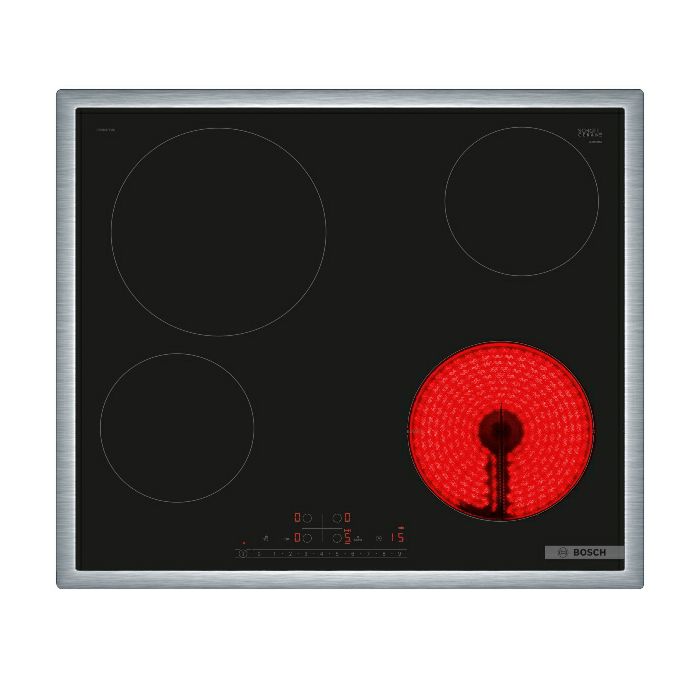Bosch PKE645FP2E Električna ploča za kuhanje, 60 cm Prednji lijevi: 145 mm, 1.2 KW Stražnji lijevi: 210 mm, 2.2 KW Stražnji desni: 145 mm , 1.2 KW Prednji desni: 180 mm, 2 KW (maks. snaga 2.3 KW) DirectSelect: izravan, jednostavan odabir željene zone kuhanja, snage i dodatnih funkcija: nadzirite snagu utisnutom dodirnom trakom. 17 stupnjeva: precizno prilagodite toplinu sa 17 razina snage (9 glavnih razina i 8 srednjih razina). Elektronički programski sat s funkcijom isključivanja i opomenom za svako polje za kuhanje : isključuje zonu za kuhanje po završetku postavljenog vremena (npr. za kuhana jaja). Elektronički programski sat : alarm se oglašava na kraju postavljenog vremena (npr. za tjesteninu). PowerBoost funkcija na određenim zonama kuhanja: brže prokuhajte vodu zahvaljujući 20% više energije nego na najvišoj standardnoj razini. ReStart funkcija: u slučaju nenamjernog isključivanja, vratite sve prethodne postavke ponovnim uključivanjem ploče za kuhanje u roku od 4 sekunde. Klasični okvir Digitalni dvostupanjski indikator preostale topline za svako polje za kuhanje: prikazuje koja su područja za kuhanje još uvijek vruća ili topla. Dječija sigurnosna brava: spriječava nenamjerno aktiviranje ploče za kuhanje. Zaštita kod brisanja: obrišite prekipjele tekućine bez nenamjernog mijenjanja postavki (blokiranje svih dodirnih tipki na 30 sekundi). Glavni prekidač: isključite sve zone za kuhanje pritiskom na tipku. Indikator uključivanja: prikazuje zagrijava li se ploča za kuhanje. Sigurnosno isključivanje: iz sigurnosnih razloga, grijanje se zaustavlja nakon unaprijed određenog vremena bez interakcije (prilagodljivo). Prikaz potrošnje energije: prikazuje potrošnju električne energije u posljednjem postupku kuhanja. Dimenzije proizvoda (VxŠxD mm): 48 x 583 x 513 Potrebna veličina niše za ugradnju (VxŠxD mm) : 48 x 560 x (490 - 500) Min. debljina radne površine: 16 mm Priključna snaga: 6.9 KW
