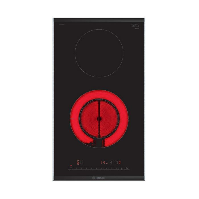 Bosch PKF375FP2E Domino električna ploča za kuhanje, 30 cm Ring zone double: upotrijebite uobičajeno ili veće posuđe na proširivoj zoni kuhanja. Prednji: 120 mm, 180 mm, 1 KW (maks. snaga 2.3 KW) Stražnji: 145 mm, 1.2 KW DirectSelect upravljanje: izravno upravljajte snagom putem dodirne trake 17 stupnjeva: precizno prilagodite toplinu sa 17 razina snage (9 glavnih razina i 8 srednjih razina). Elektronički programski sat s funkcijom isključivanja i opomenom za svako polje za kuhanje : isključuje zonu za kuhanje po završetku postavljenog vremena (npr. za kuhana jaja). Elektronički programski sat : alarm se oglašava na kraju postavljenog vremena (npr. za tjesteninu). Brojač vremena kuhanja : pokazuje koliko je vremena prošlo od pokretanja odbrojavanja (npr. za krumpir). PowerBoost funkcija na određenim zonama kuhanja: brže prokuhajte vodu zahvaljujući 20% više energije nego na najvišoj standardnoj razini. ReStart funkcija: u slučaju nenamjernog isključivanja, vratite sve prethodne postavke ponovnim uključivanjem ploče za kuhanje u roku od 4 sekunde. Izbrušeni prednji rub, ukrasne letvice sa strane Digitalni dvostupanjski indikator preostale topline za svako polje za kuhanje: prikazuje koja su područja za kuhanje još uvijek vruća ili topla. Dječija sigurnosna brava: spriječava nenamjerno aktiviranje ploče za kuhanje. Glavni prekidač: isključite sve zone za kuhanje pritiskom na tipku. Indikator uključivanja: prikazuje zagrijava li se ploča za kuhanje. Sigurnosno isključivanje: iz sigurnosnih razloga, grijanje se zaustavlja nakon unaprijed određenog vremena bez interakcije (prilagodljivo). Prikaz potrošnje energije: prikazuje potrošnju električne energije u posljednjem postupku kuhanja. Dimenzije proizvoda (VxŠxD mm): 38 x 306 x 527 Potrebna veličina niše za ugradnju (VxŠxD mm) : 38 x 270 x (490 - 500) Min. debljina radne površine: 16 mm Priključna snaga: 3.5 KW Priključni kabel: 1 m, Kabel uključen