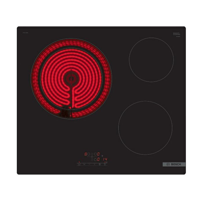 Bosch PKK611BB2E Električna ploča za kuhanje, 60 cm Ring zone double: upotrijebite uobičajeno ili veće posuđe na proširivoj zoni kuhanja. Stražnji lijevi: 210 mm, 275 mm, 2 KW Stražnji desni: 145 mm , 1.2 KW Prednji desni: 180 mm, 2 KW TouchSelect Basic: nadzirite snagu utisnutim tipkama +/- dodir. 17 stupnjeva: precizno prilagodite toplinu sa 17 razina snage (9 glavnih razina i 8 srednjih razina). Timer za isključivanje: isključuje zonu za kuhanje po završetku postavljenog vremena (npr. za kuhana jaja). Brojač vremena za odbrojavanje: alarm se oglašava na kraju postavljenog vremena (npr. za tjesteninu). ReStart funkcija: u slučaju nenamjernog isključivanja, vratite sve prethodne postavke ponovnim uključivanjem ploče za kuhanje u roku od 4 sekunde. QuickStop: brzo isključite zonu za kuhanje jednim duljim dodirom. Bez okvira Digitalni dvostupanjski indikator preostale topline za svako polje za kuhanje: prikazuje koja su područja za kuhanje još uvijek vruća ili topla. Dječija sigurnosna brava: spriječava nenamjerno aktiviranje ploče za kuhanje. Glavni prekidač: isključite sve zone za kuhanje pritiskom na tipku. Indikator uključivanja: prikazuje zagrijava li se ploča za kuhanje. Sigurnosno isključivanje: iz sigurnosnih razloga, grijanje se zaustavlja nakon unaprijed određenog vremena bez interakcije (prilagodljivo). Dimenzije proizvoda (VxŠxD mm): 45 x 592 x 522 Potrebna veličina niše za ugradnju (VxŠxD mm) : 45 x 560 x (490 - 500) Min. debljina radne površine: 16 mm Priključna snaga: 5.7 KW