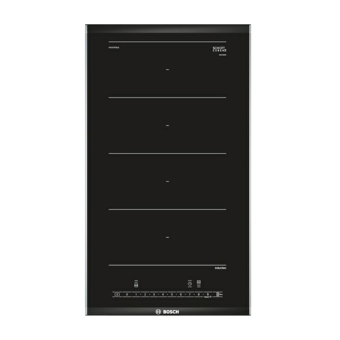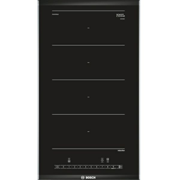 PXX375FB1E Indukcijska staklokeramička ploča za kuhanje Za kombinaciju s drugim staklokeramičkim pločama u comfort design DirectSelect: izravan, jednostavan odabir željene zone kuhanja FlexInduction zona: veća fleksibilnost s kombiniranjem zona kuhanja u jednu veliku zonu za manje lonce i veliko kuhinjsko posuđe ComfortProfil PowerBoost Priključni kabel: 1,1 m Priključna snaga: 3,7 kW Polja za kuhanje: 1 x O 400 mm x 210 mm, 3.3 kW (maks. snaga 3.7 kW) ili 2 x O 200 mm, 2.2 kW (maks. snaga 3.7 kW) Min. debljina radne površine: 30 mm Visina proizvoda: 57 mm Širina: 306 mm Dubina proizvoda: 527 mm Težina: 8 kg Pojedini modeli indukcijskih ploča za kuhanje imaju tehničko ograničenje u vidu minimalnog promjera posude za kuhanje. Navedenu karakteristiku molimo provjeriti u uputama za rad ili upitom korisničkoj podršci.