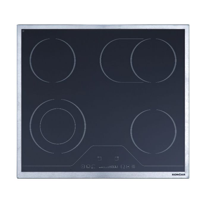 Končar UKE6040KOCVSFF Električna ploča za kuhanje Boja: crna Visina/ Širina/ Dubina kuhala: 4,5x59x52 cm Visina/ Širina/ Dubina otvora u kuh.elementu: 56×49 cm Prednje lijevo mjesto za kuhanje: el. duo zona o21cm/2,2kW Prednje desno mjesto za kuhanje: el. zona o14,5cm/1,2kW Stražnje lijevo mjesto za kuhanje: el. zona o14,5cm/1,2kW Stražnje desno mjesto za kuhanje: el. ovalna zona o14cm // 1/1,8kW Pokazivač zaostale topline Radna ploča: staklokeramička Touch control Puni inox okvir Električni priključak: 1N Napon: 230/400V~ Dimenzije zapakiranog proizvoda: 63,1x58x14,3 cm Masa aparata neto/bruto: 9,5/10,25 kg