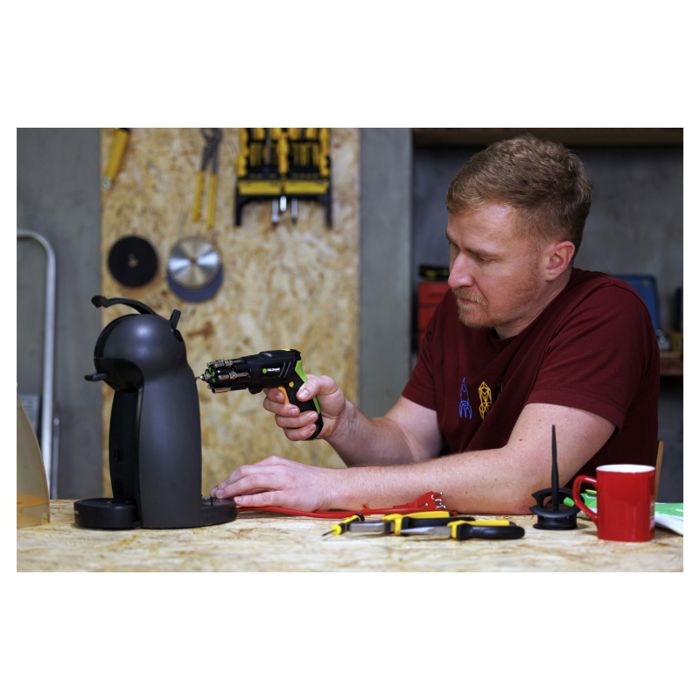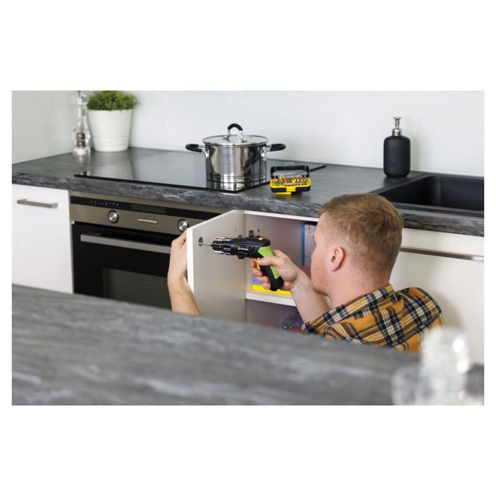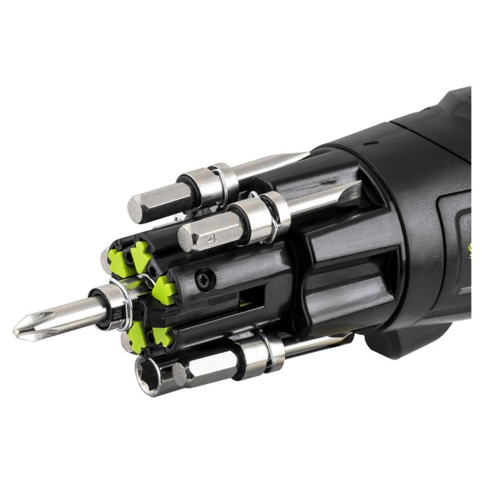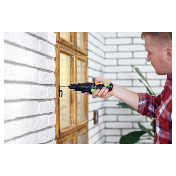Litij-ionska baterija 3,6 V/1 300 mAh Okretaj 180 o/min Moment 4 Nm 6 razina momenta Rotirajuća ručka – 2 položaja Prekidač smjera rotacije LED svjetlo LED indikator baterije Vrijeme punjenja 3–5 sati Težina 0,49 kg
