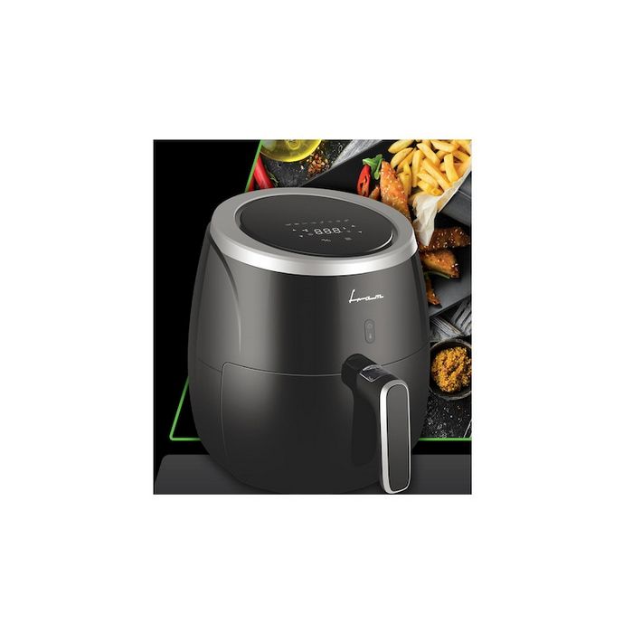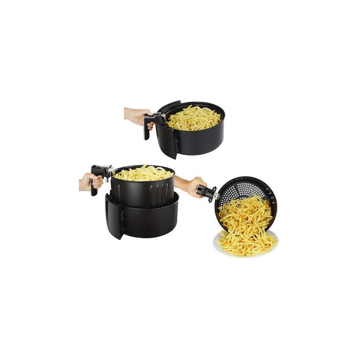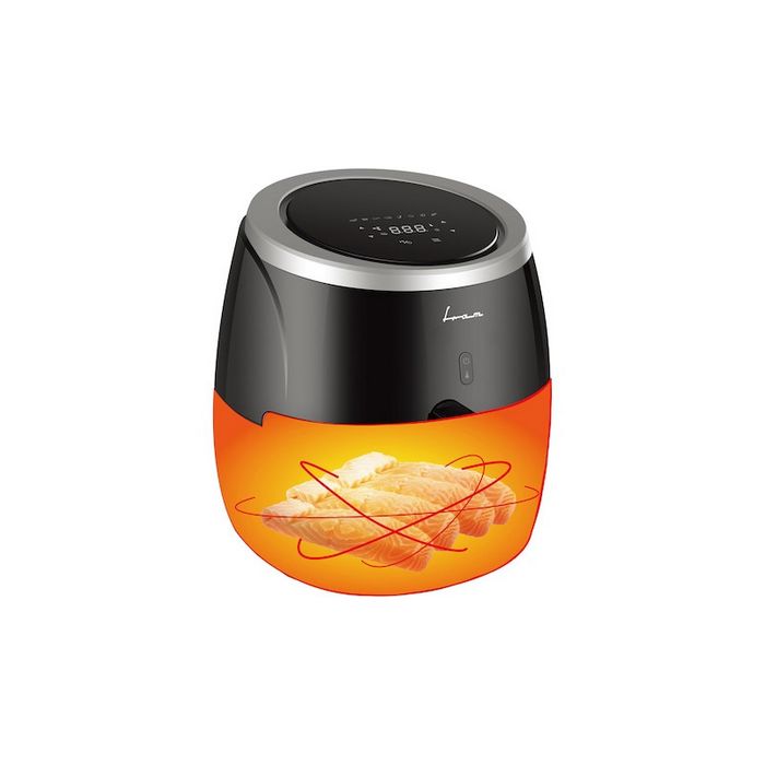 Specifikacije Digitalni zaslon Kontrola dodira Kapacitet košarice: 5 Litara Uklonjiva antiljepljiva posuda Podesiva temperatura: 80-200°C Tajmer: max 60min Zaštita od pregrijavanja Snaga: 2000W Boja : Crna