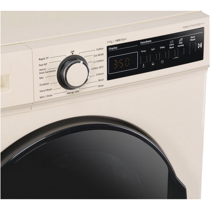 Kapacitet 7kg Brzina centrifuge 1400 o / min Energetski razred D 15 programa LED zaslon s vremenom prikaza, temperaturom, brojem rotacija Brzi program 15 min Kratki program 60 min Program siguran za alergije Odgođeni start (opis funkcije) Funkcija protiv nabora Sustav eko logike Sustav za detekciju pjene Elektronički sustav kontrole ravnoteže Blokiranje pristupa djeci Dimenzije: 59,7x52,7x84,5 cm Boja: Sjajna krem