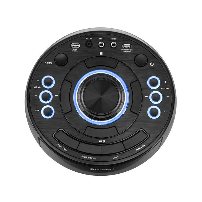 Party zvučnik GoGEN BPS 736 CD HAPPEE - LCD zaslon - Bluetooth bežični streaming - Karaoke - Mikrofon je uključen u paket - CD pogon - Digitalni FM tuner, 30 unaprijed postavljenih postavki - Podrška za MP3 format - Unaprijed postavljeni ekvilajzeri - Svjetlosni LED efekti - Punjiva baterija - reprodukcija s jednim punjenjem do 22 sata - Frekvencijski raspon 40 Hz - 15 kHz - Izlazna snaga 90 W