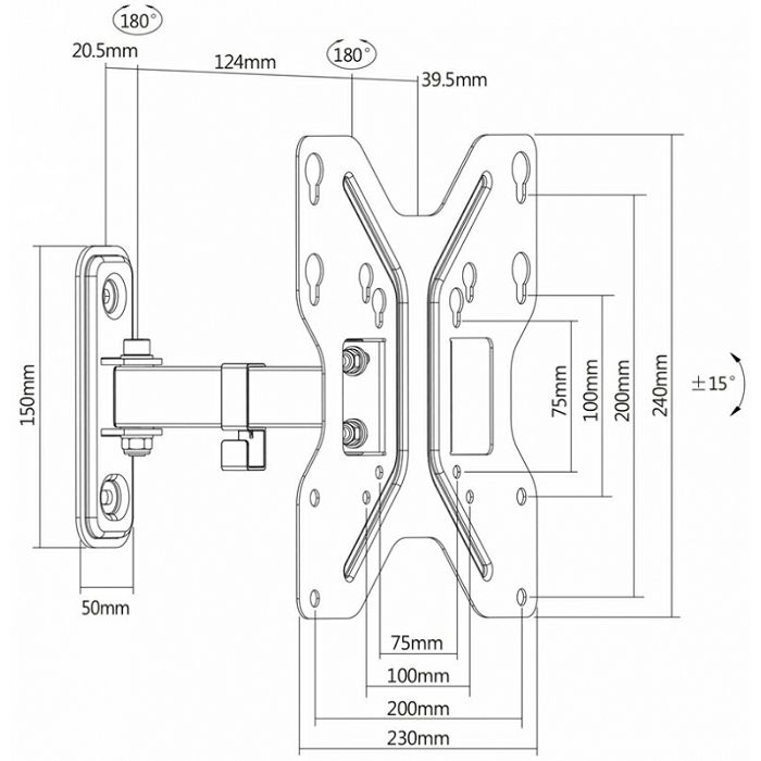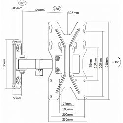 Univerzalni okretni / podesivi zidni nosač marke GoGEN za LED, LCD i plazma televizore. Nosač omogućuje brzu i jednostavnu montažu na zid, zahvaljujući kompletnoj montažnoj opremi. VESA standardi do 200 x 200 mm i široki raspon kretanja do 180 ° rotacije, -15 ° do + 15 ° nagiba i 49-184 mm offset. Struktura konzole je prikladna do max 42" i 30 kg. Tehničke značajke: - za max. dijagonalu 43" (109 cm) - rukom za lakše okretanje/usmjeravanje TV-a - pogodan za razmak između VESA rupa 75x75; 100x100; 200x100; 200x200 mm - mogućnost nagiba +15°C do -15°C - mogućnost rotacije + 90 ° do -90 ° C - Udaljenost televizora od zida 49-184 mm - nosivost 30 kg - metalni materijali - crne boje