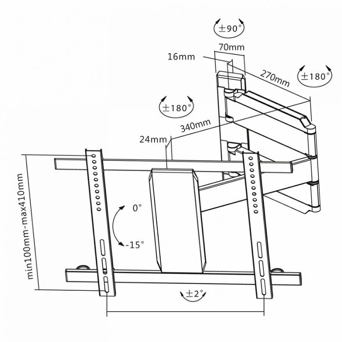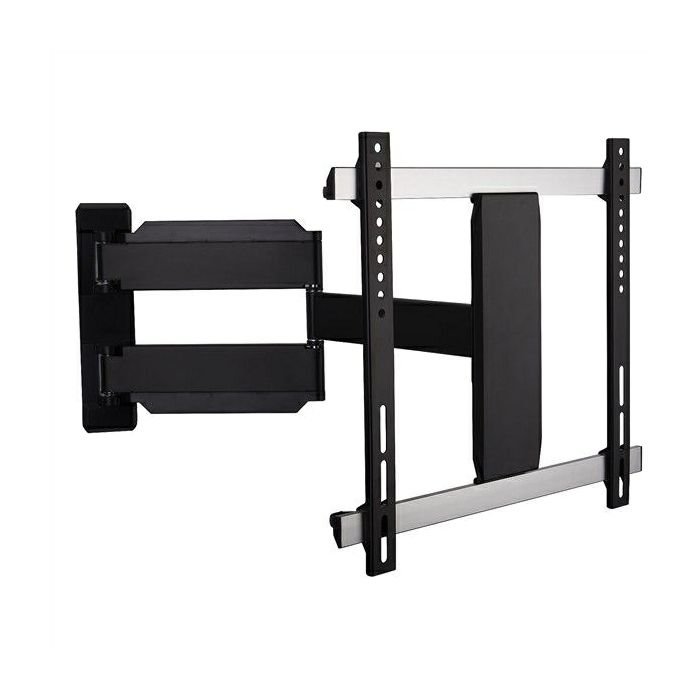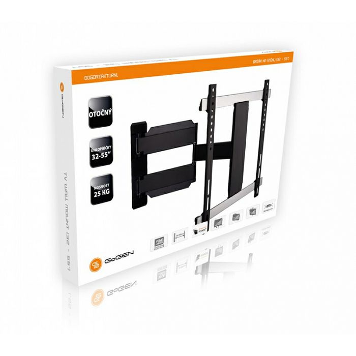Univerzalni okretni / podesivi GoGEN zidni nosač za LED, LCD i plazma televizore za postavljanje idealnog kuta za udobno gledanje televizije. Nosač nudi brzu i jednostavnu montažu na zid. Odlikuje se inteligentnim sustavom za montažu TV-a s VESA standardima do 400 x 400 mm i širokim rasponom rotacije od +/- 180°, nagibom do 15° i povlačenjem od 36 do 650 mm. Dizajn nosača testiran je za televizore dijagonale do 55" i težine do 25 kg. Izrađena je od kombinacije čvrstog čelika, a zahvaljujući velikom rasponu kraka, postići ćete minimalni i maksimalni odmak od zida od 36 - 650 mm. Tehničke značajke: - za dijagonalu do 55" ( 140 cm) - pogodan za: 200x100; 200x200; 200x300; 300x200; 300 x 300; 400 x 200; 400 x 300; 400x400 mm - mogućnost nagiba od 0° do -15° - mogućnost rotacije + 90° do -90° - udaljenost TV-a od zida 36-650 mm - maksimalno opterećenje 25 kg - materijal čelik/aluminij - Crna boja - vodeni kamenac