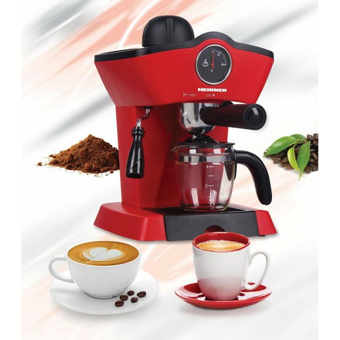 Heinner HEM-200RD aparat za espresso, snaga: 800 W, prozirni odvojivi kapacitet spremnika: 250 ml, tlak pumpe: 3,5 bara, prednji termometar za vodu, mogućnosti pripreme: espresso i cappuccino, uklonjivi odvodni pladanj, kotao od aluminijske legure, filtar za 4 šalice kave, boja: crvena