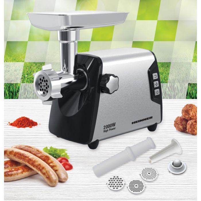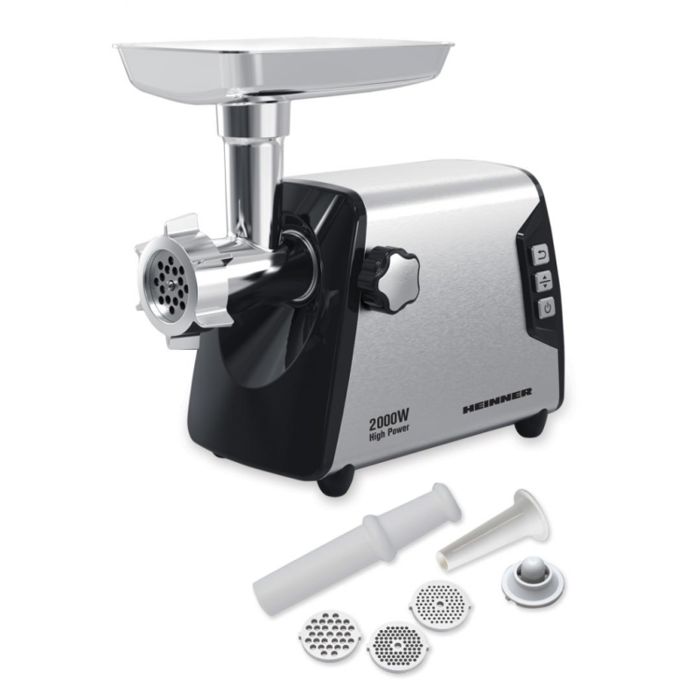 Heinner Blade Pro HMG-Y2000SS aparat za mljevenje mesa, maksimalna snaga: 2000W, metalni zupčanik i aluminijsko kućište, funkcija obrnutog kretanja, nož od nehrđajućeg čelika, 3 metalna sita, pribor za kobasice, gumb prekidača s 2 brzine, kapacitet sjeckanja: ~ 3kg / min, kućište od nehrđajućeg čelika
