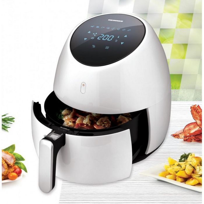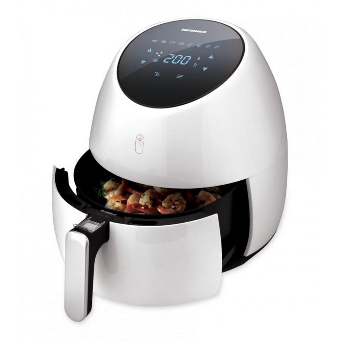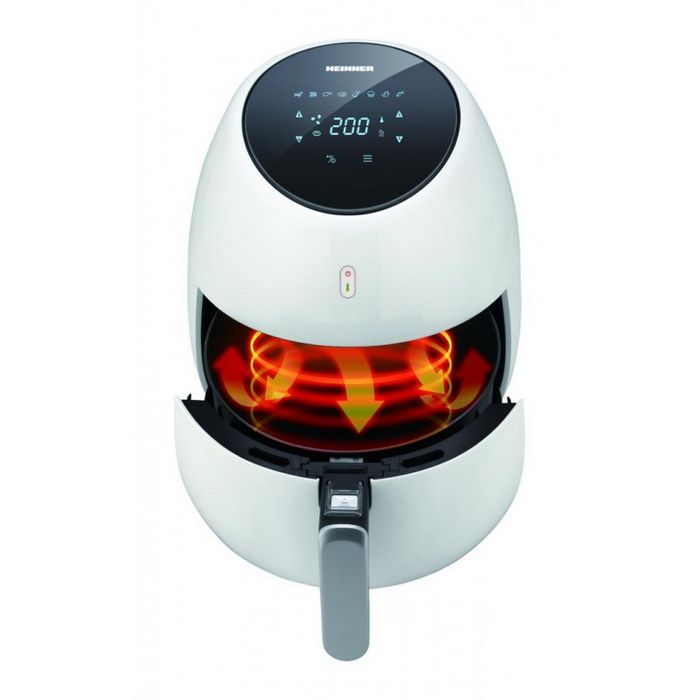 Opis proizvoda Heinner HAF-B2000WH friteza za vrući zrak, snaga: 2000W, kapacitet: 5L, digitalni zaslon, upravljačka ploča osjetljiva na dodir, neprijanjajuća odvojiva posuda, podesivi termostat: 80-200 °C, mjerač vremena - maksimalno trajanje 60 min, odvojiva košara za pripremu, zaštita od pregrijavanja, protuklizne noge Neto dimenzije Visina 33,7 cm Dubina 34,8 cm Širina 28 cm Vrući zrak Kapacitet 5L Snaga 2000W Neprijanjajuća odvojiva posuda