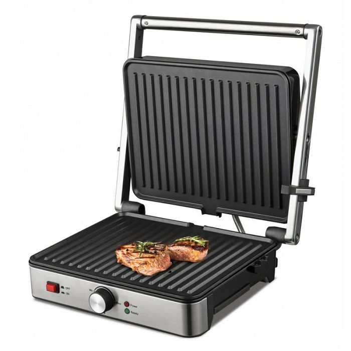 Fiksne ploče s neprijanjajućim premazom, veličine ploča: 30 x 24,9 cm, podesiva temperatura, hladna ručka, otvor od 180 °, indikatorsko svjetlo "UKLJUČENO" i "Spremno za upotrebu", pladanj za skupljanje ulja, snaga: 2000W Neto dimenzije Težina 3,04 kg Visina 12,90 cm Širina 35,70 cm Dubina 34,40 cm Opće specifikacije Vrsta korištenja Roštilj Vrsta ploča Fiksirane Snaga 2000W Funkcije roštilja Podesiva temperatura, otvaranje od 180 stupnjeva, hladna ručka Pribor Ladica za prikupljanje ulja