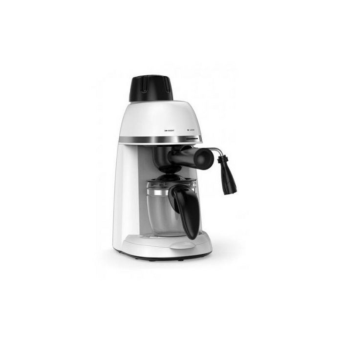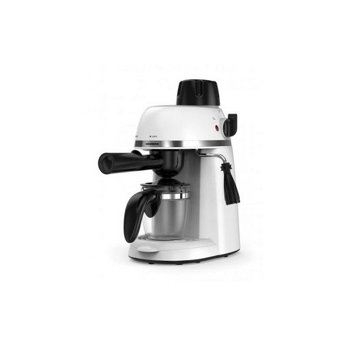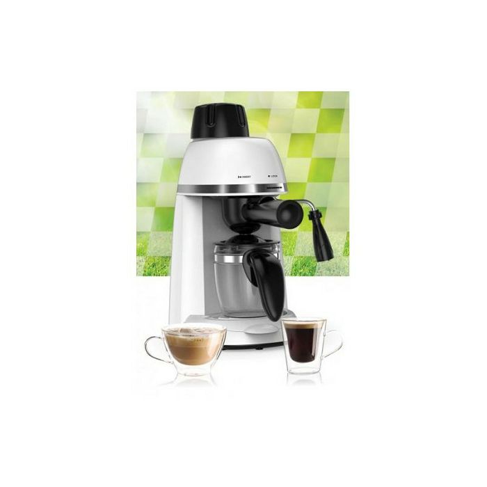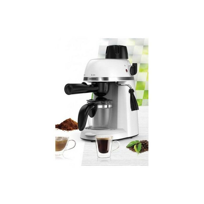 Tlak od 3,5 bara Filter od nehrđajućeg čelika Kapacitet: 240 ml KarakteristikeKotao od legure aluminija Opcije : espresso i cappuccino Staklena vrč Tehnički podaciSnaga: 800W Napon: 220-240 ~ 50-60HzZa espresso aparate preporuka je koristiti srednje fino mljevenu kavu ! Fino ili ekstra fino mljevena kava može začepiti čeličnu mrežicu od aparata.