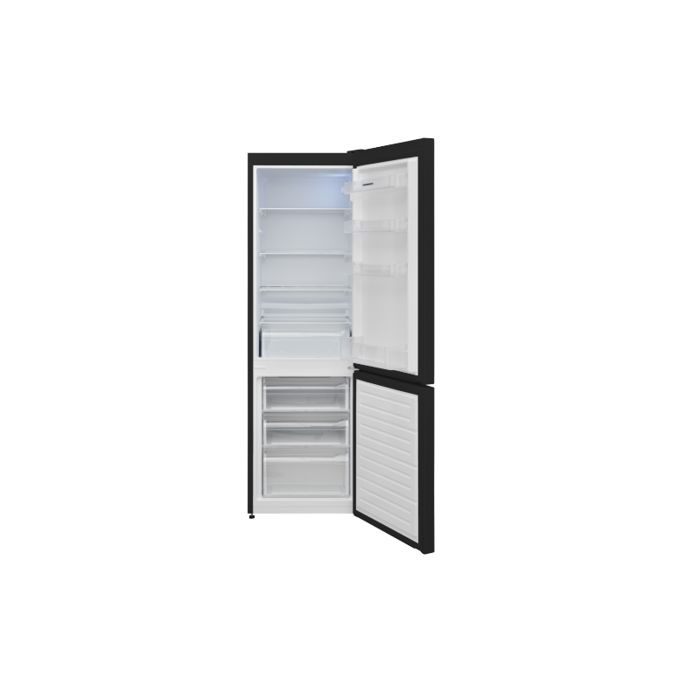 Hladnjak Heinner HC-V2681BKE++, energetski razred: E, ukupni kapacitet: 268L, kapacitet hladnjaka: 184L, kapacitet zamrzivača: 84L, mehanička kontrola s podesivim termostatom, LED svjetlo, 3 staklene police hladnjaka, 3 ladice zamrzivača, pretinac za voće i povrće, reverzibilan vrata, držač za jaja, posuda za led, kapacitet zamrzavanja: 3,9 kg/24h, dimenzije: 54 x 59,5 x 170 cm, boje: crna s kromiranim ukrasom na ručkama