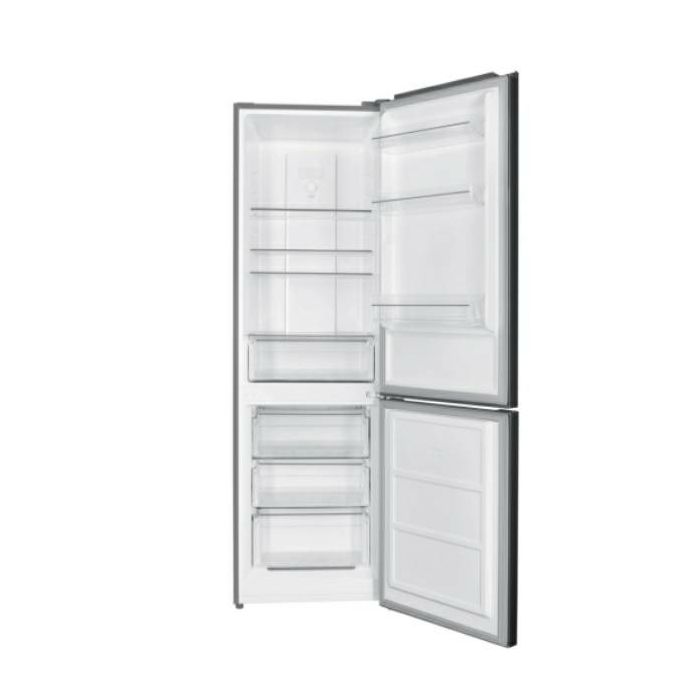 Heinner HCNF-HM293XE++ hladnjak, No Frost, energetska klasa: E, ukupni kapacitet: 293L, kapacitet hladnjaka: 210L, kapacitet zamrzivača: 83L, elektroničko upravljanje s podesivim termostatom, LED svjetlo, 3 staklene police hladnjaka, pretinac za voće i povrće, 3 ladice za zamrzavanje, držač za jaja, posuda za led, kapacitet zamrzavanja: 3,8 kg/24h, dimenzije (ŠxDxV): 60 x 60 x 186 cm, boja: Izgled nehrđajućeg čelika s crnom ručkom