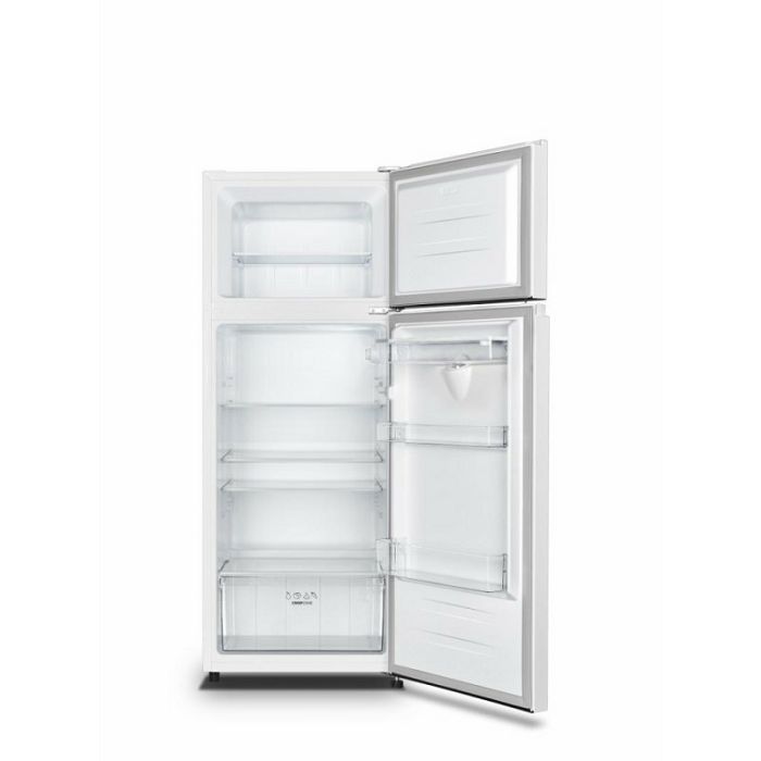 Heinner kombinirani hladnjak HF-205WDF+ hladnjak s dvoje vrata, energetski razred: F, dozator vode, ukupni kapacitet: 206L, kapacitet hladnjaka: 165L, kapacitet zamrzivača: 41L, mehaničko upravljanje s podesivim termostatom, LED svjetlo, 3 staklene police, odjeljak za voće i povrće, reverzibilna vrata, držač jaja, pladanj za kockice leda, kapacitet smrzavanja: 2kg / 24h, dimenzije (ŠxDxV): 55 x 54,2 × 143,4 cm, Boja: bijela s elegantnom crnom ručkom