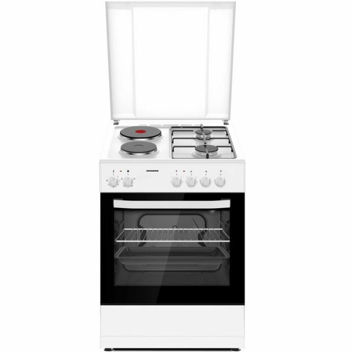 HEINNER HFSC-S60E2HSWH KOMBINIRANI ŠTEDNJAK, 60X60CM, 2 PLINSKA PLAMENIKA + 2 ELEKTRIČNA KUHALA, EMAJLIRANI POKLOPAC, METALNI POKLOPAC, ELEKTRIČNO PALJENJE PLAMENIKA, SIGURNOSNI UREĐAJ PLAMENIKA, ELEKTRIČNA PEĆNICA, KLASA A, 5 FUNKCIJA, ROŠTILJ, SVJETLO PEĆNICE, VRATA PEĆNICE S DVOSTRUKIM STAKLOM, UKLJUČENE MLAZNICE ZA LPG, KROMIRANA POSUDA I ROŠTILJ, DIMENZIJE (DxŠxV): 60X60X83 CM, BOJA: BIJELA