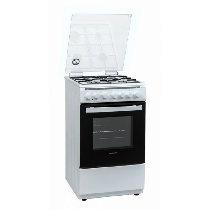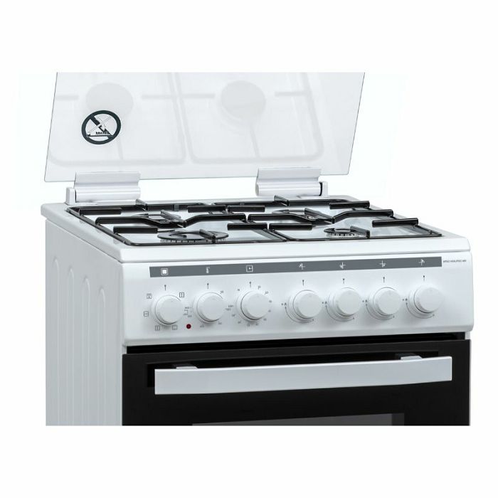 Kombinirani štednjak Heinner HFSC-V60LITGC-WH, 50x60cm, 4 plamenika, držač cakline, stakleni poklopac, električna ploča za paljenje, ploča za sigurnosne uređaje, električna pećnica, 6 funkcija, tajmer, roštilj, ventilacija, odmrzavanje, svjetlo pećnice, dvostruko odvojiva staklena vrata pećnice, uključene mlaznice UNP-a, pladanj i kromirani roštilj, dimenzije (DxAxI): 50x60x85 cm, boja: bijela