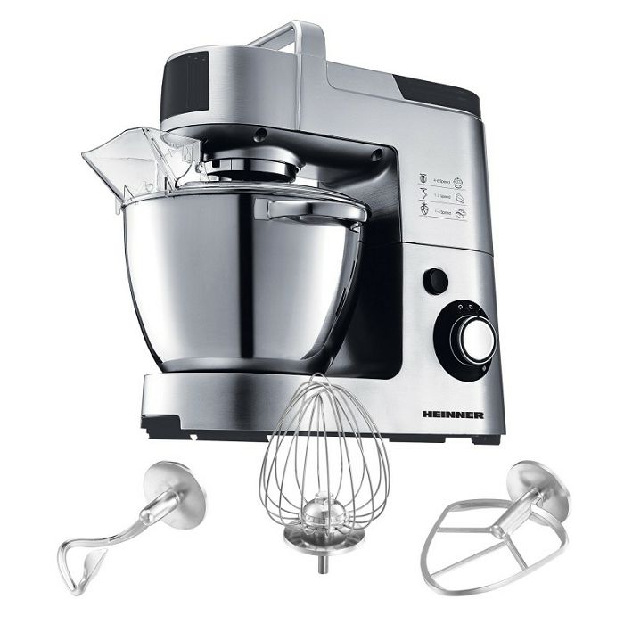 Heinner HPM-1500XMC-V2 planetarni mikser, snaga: 1500W, 6 brzina, kapacitet posude: 5,5L, tijelo miješalice od lijevanog aluminija, zdjela od nehrđajućeg čelika, zaštita od prskanja, protuklizni sustav, pribor: kuka za gnječenje, pjenjača od nehrđajućeg čelika, razina buke: 93dB