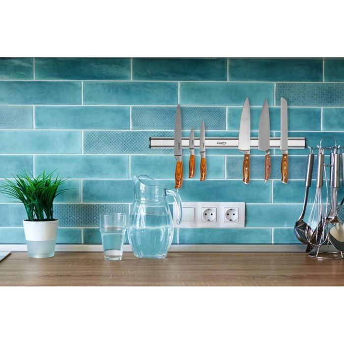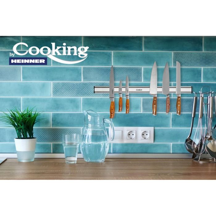 Magnetski držač za noževe 61,5x4,5x1,9cm Materijal : aluminij Magnetski nosač služi za vertikalno odlaganje noževa. Opremljen je s dva reda ugrađenih magneta za sigurno pričvršćivanje noževa. Noževi će se uvijek stavljati sa oštricom prema gore, na pravoj udaljenosti, za sigurnu upotrebu. Maksimalan broj noževa koji može biti pohranjenih na postolju je 4 - 6 komada, ovisno o širini oštrice ili veličini ručki. Paket sadrži klinove i vijke potrebne za postavljanje nosača na kuhinjski zid.