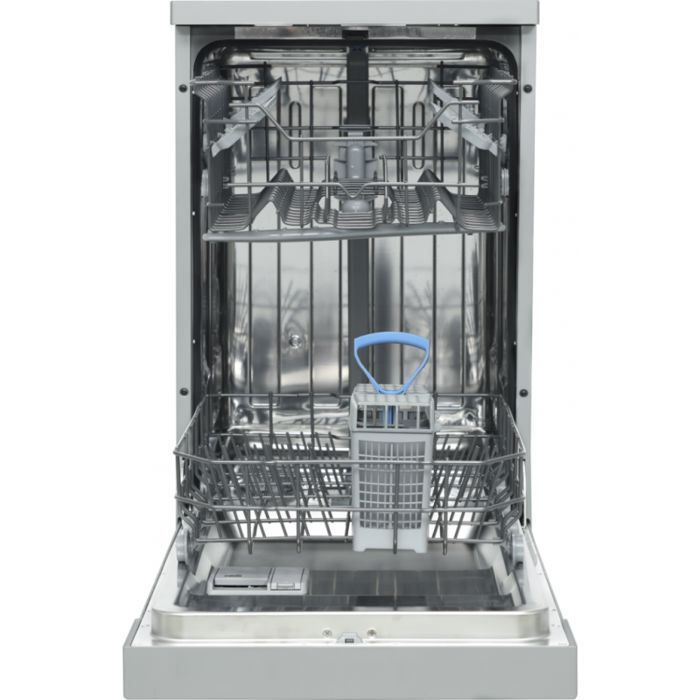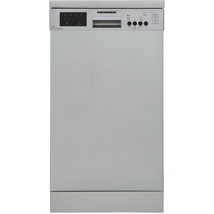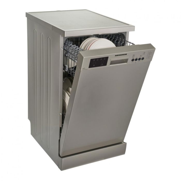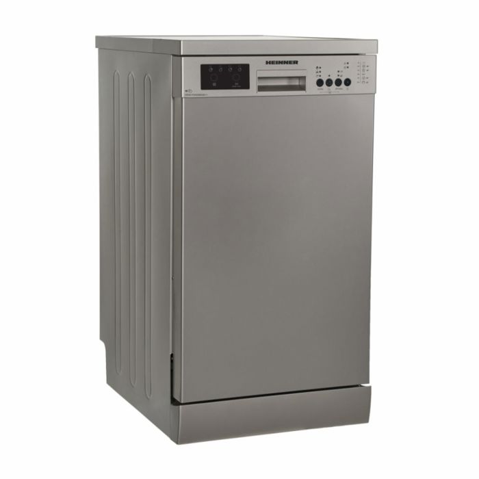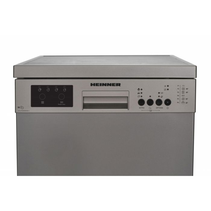 Heinner HDW-FS4506DSE++ perilica posuđa, 10 postavki, energetski razred E, elektroničko upravljanje, LED zaslon, 6 programa pranja, brzi 30' program, program za čaše/osjetljivo suđe, program za pretpranje, ECO program, opcija pola punjenja, programabilni start (1-19H ), dodatno ispiranje, opcija Extra higijene, opcija dodatnog sušenja, opcija tableta, blokada za djecu, gornja košara podesiva po visini, zaštita od poplave - Aquastop, potrošnja vode: 11L/ciklus pranja, boja: tamno srebrna, dimenzije (DxŠxV): 85 x 44,8 x 59,8 cm