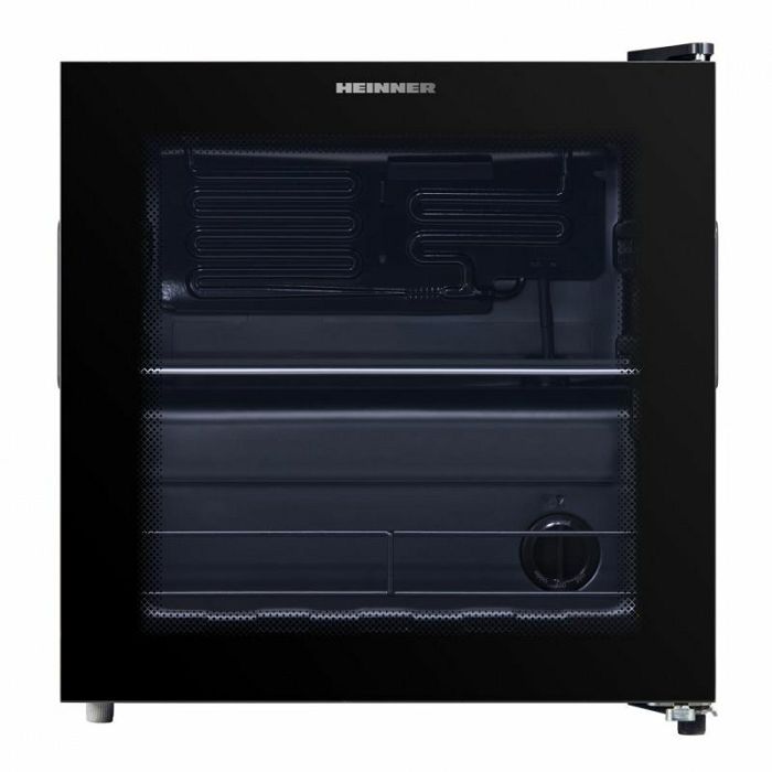 Heinner HBC-M44BKE hladnjak za pića, energetska klasa: E, ukupni kapacitet: 44L, kapacitet punjenja: 48 limenki (355 ml), mehaničko upravljanje s podesivim termostatom, 1 staklena polica, vrata s mogućnošću preusmjeravanja, dimenzije (ŠxDxV): 47 x 44 x 49,5 cm, boja: Crna