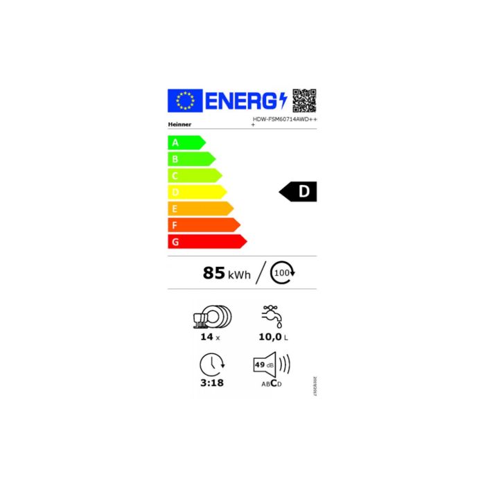 Heinner HDW-FSM60714AWD+++ Perilica posuđa, Extraload - 14 mjesta, energetska klasa D, automatsko otvaranje vrata na kraju programa, elektroničko upravljanje, LED zaslon, 7 programa pranja, Brzi 30' program, Auto Smart program: 55°C - 65°C, Dubinsko čišćenje - Higijenski program 70°C, 1H program, Intenzivni program 65°C, programabilni početak (1-24H), opcija polovičnog punjenja na obje košare - Dvozonska zona, funkcija intenzivnog pranja, Dodatna funkcija sušenja, 3 košare - gornja košara za pribor za jelo, Fleksibilan prostor - gornja košara s podesivom visinom (napunjena), donja košara: 4 sklopiva držača za tanjure, dječja brava, zaštita od poplave - Aquastop, potrošnja vode: 10L/ciklus pranja, dimenzije (ŠxVxD): 60 x 60 x 85 cm, boja: Bijela