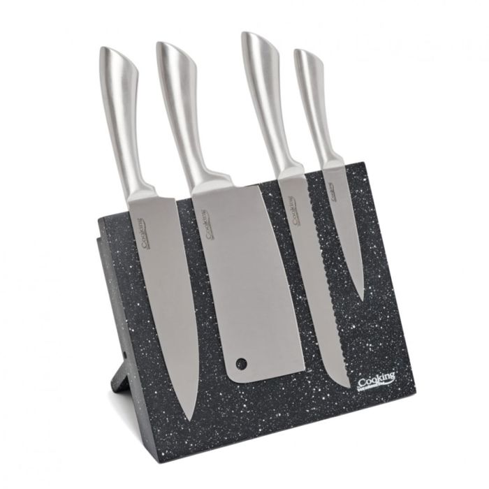 SET OD 5 KOMADA KUHINJSKIH NOŽEVA, SILVER Material: nehrđajući čelik 1 x satara 30 cm, veličina noža: 18cm 1 x kuharski nož 33 cm, veličina oštrice: 20 cm 1 x nož za kruh, 33 cm, veličina noža: 20 cm 1 x nož za uporabu 22 cm, veličina noža: 13 cm 1 x držač magnetskog noža, drveni: 22 x 3 x 24 cm
