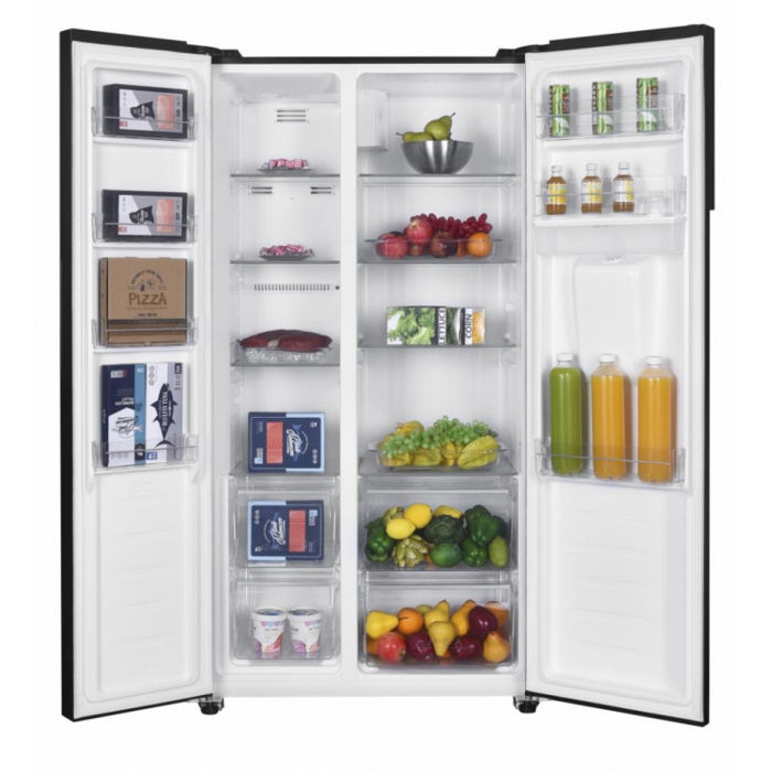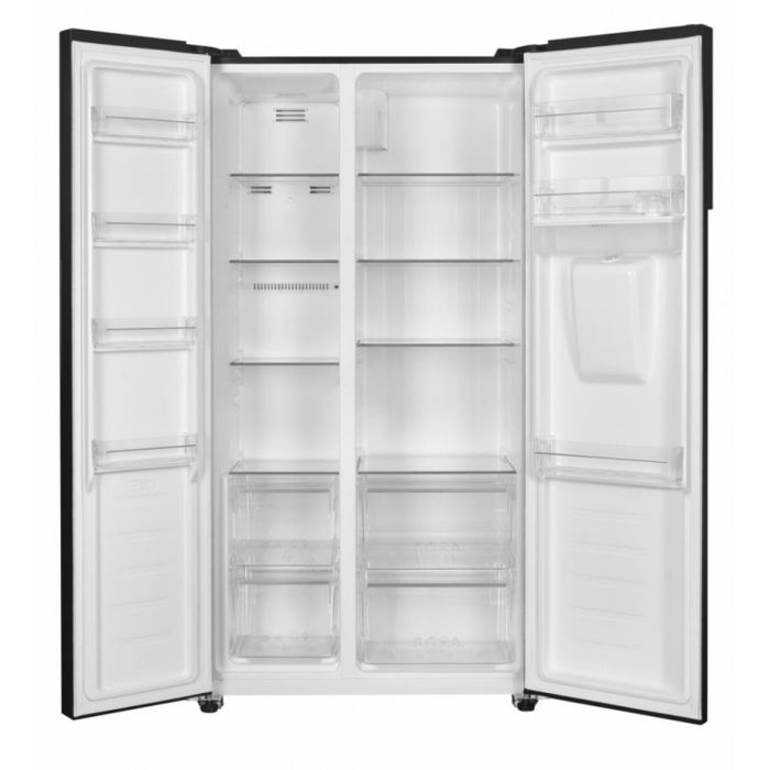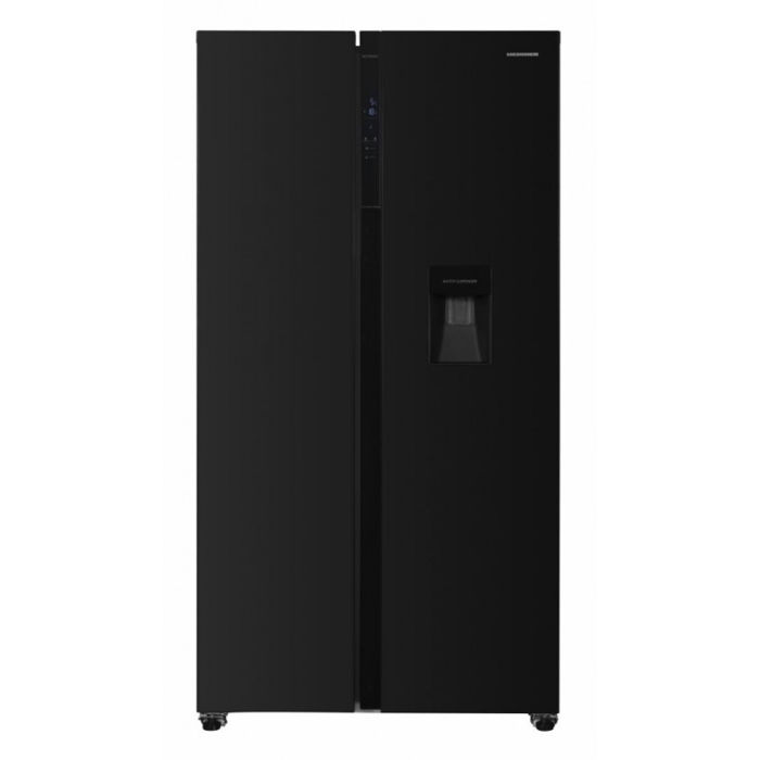 Heinner side by side hladnjak HSBS-H439NFBKWDE ++, Full No frost, Inverterski kompresor, Dozator vode, Energetski razred E, LED zaslon s kontrolom dodira, Ukupni kapacitet: 439L, Kapacitet hladnjaka: 288L, Kapacitet zamrzivača: 151L, LED svjetlo, SMART funkcija, ECO funkcija, Super hlađenje, Super zamrzavanje, Alarm otvorenih vrata, Dječja pristupna brava, 3 staklene police hladnjaka, 2 odjeljka za voće i povrće, 3 police zamrzivač, 2 ladice zamrzivač, Dimenzije proizvoda: 90 x 59,5 x 177 cm, Boja: Crna