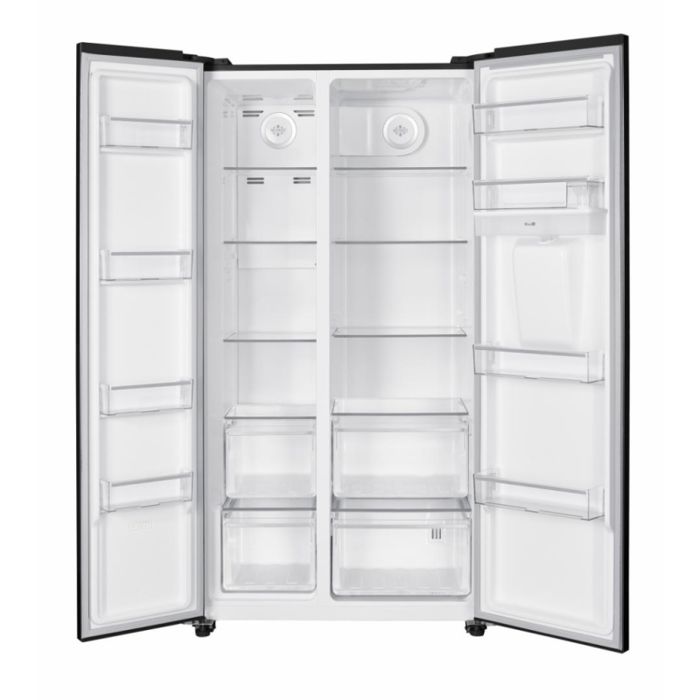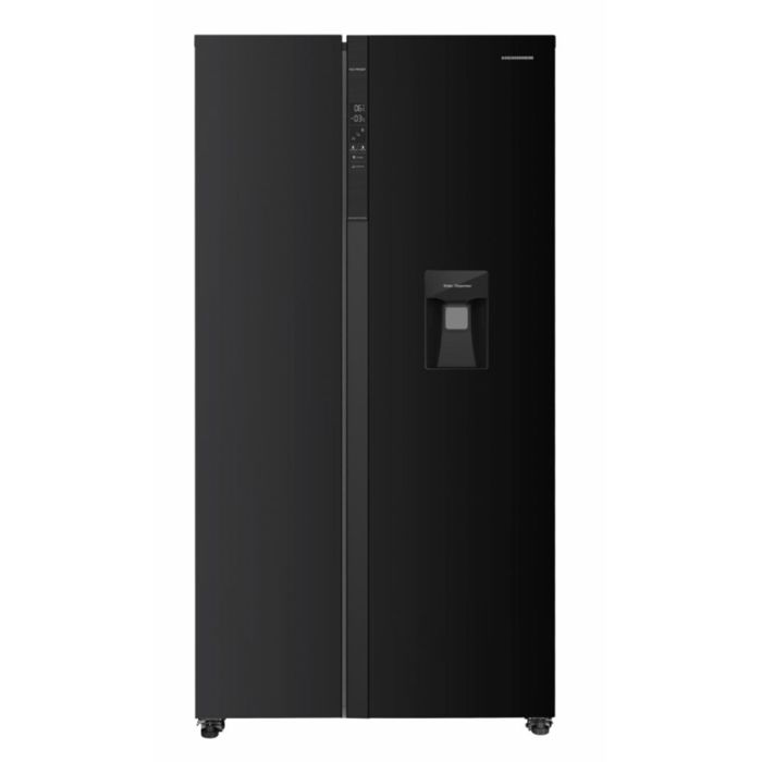 Side by side hladnjak Heinner HSBS-HM529NFBKWDE++, Full No Frost, inverterski kompresor, dozator vode, energetski razred učinkovitosti: E, LED zaslon s upravljanjem na dodir, ukupni kapacitet: 529 L, kapacitet hladnjaka: 344 L, kapacitet zamrzivača: 185 L, LED rasvjeta, pametna funkcija, ECO funkcija, funkcija brzog hlađenja (Super Cooling), funkcija brzog zamrzavanja (Super Freezing), alarm za otvorena vrata, dječja zaštita, 3 staklene police u hladnjaku, 2 pretinca za voće i povrće, 3 staklene police u zamrzivaču, 2 ladice u zamrzivaču, kapacitet spremnika za vodu: 2,5 L, dimenzije (Š x D x V): 90 x 66 x 177 cm, boja: crna.