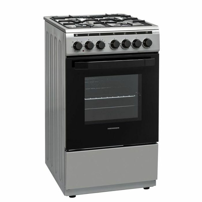 Heinner štednjak HFSC-V60LITGC-SS, 50x60cm, 4 plamenika, Emajlirani nosač, Stakleni poklopac, Električno paljenje ploče za kuhanje, Sigurnosni uređaj ploče za kuhanje, Električna pećnica, 6 funkcija, Timer, Roštilj, Ventilacija, Odmrzavanje, Svjetlo u pećnici, Vrata pećnice s dvostrukim staklom odvojivo, LPG mlaznice uključene, Kromirana posuda i rešetka, Dimenzije (ŠxDxV): 50x60x85 cm, Boja: Nehrđajući čelik