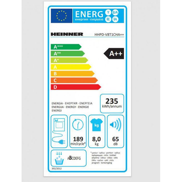 Sušilica rublja s toplinskom pumpom Heinner HHPD-V8T1CHA++, Nosivost 8 kg, Energetski razred A++, 15 programa sušenja, LED zaslon, Brzi raspored košulja 20 min, Brzi raspored košulja 34 min, Ekspresni program 59 min, Program za njegu osjetljive tkanine, Funkcija odgođenog starta, Funkcija protiv bora, VAT svjetlo, Selektor razine sušenja, Lint indikator čišćenja filtera, Indikator spremnika za prikupljanje pune vode, Dječja pristupna brava, Dimenzije (LxAxI): 6,56x3,84x5,<> cm, Boja: Bijela Opće specifikacije Energetski razred A++ Broj programa 15 Kapacitet sušilice 8 kg Boja Bijeli Funkcije Odgođeni početak, njega osjetljive tkanine, svjetlo za PDV, brava za pristup djeci, protiv gužvanja,razine sušenja Upravljačka ploča VODIO Brzo trajanje programa 20 min Motor Standard