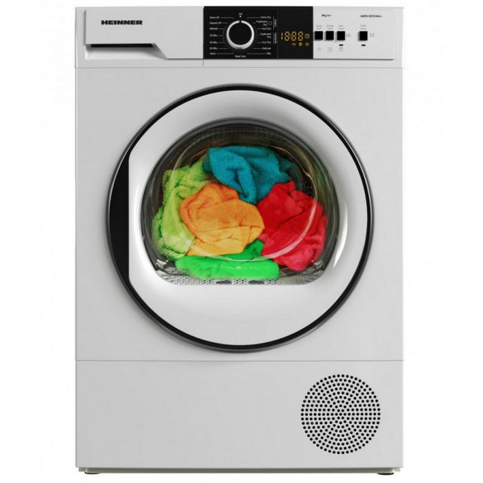 Sušilica rublja s toplinskom pumpom Heinner HHPD-V9T1CHA++ kapacitet 9 kg, Energetski razred A++, 15 programa sušenja, LED zaslon, Brzi raspored košulja 20 min, Brzi raspored košulja 34 min, Ekspresni program 59 min, Program za njegu osjetljive tkanine, Funkcija odgođenog starta, Funkcija protiv bora, VAT svjetlo, Selektor razine sušenja, Lint indikator čišćenja filtera, Indikator spremnika za prikupljanje pune vode, Dječja pristupna brava, Dimenzije (LxAxI): 6,56x3,84x5,<> cm, Boja: Bijela Opće specifikacije Energetski razred A++ Broj programa 15 Kapacitet sušilice 9 kg Boja Bijeli Funkcije Odgođeni početak, njega osjetljive tkanine, svjetlo za PDV, brava za pristup djeci, protiv gužvanja,razine sušenja Upravljačka ploča VODIO Brzo trajanje programa 20 min Motor Standard