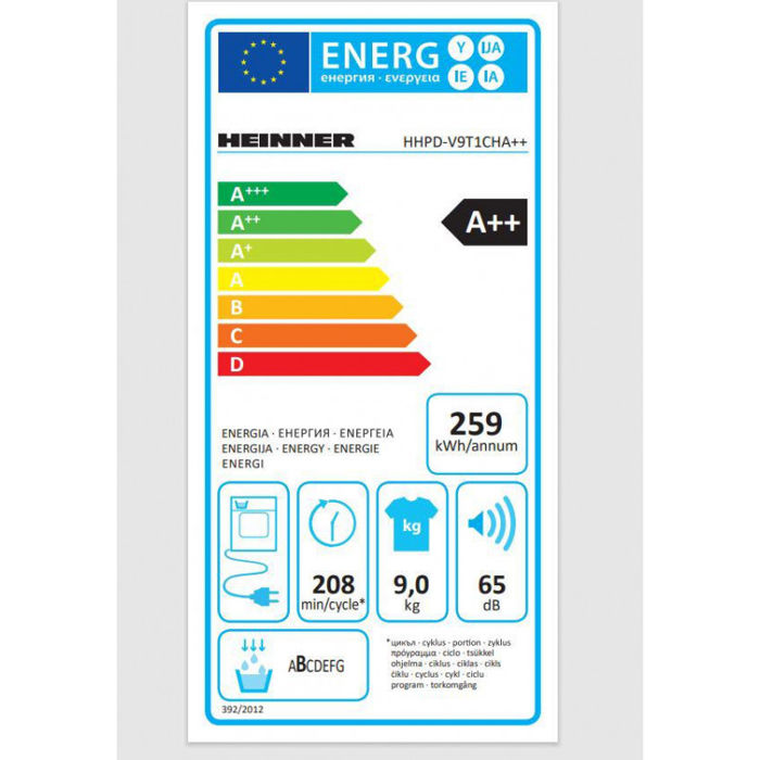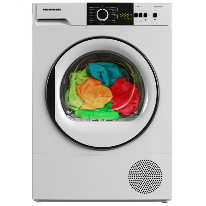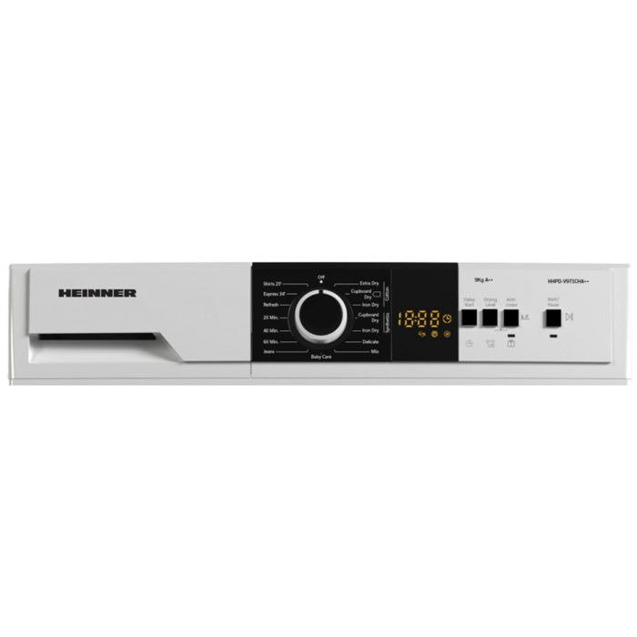Sušilica rublja s toplinskom pumpom Heinner HHPD-V9T1CHA++ kapacitet 9 kg, Energetski razred A++, 15 programa sušenja, LED zaslon, Brzi raspored košulja 20 min, Brzi raspored košulja 34 min, Ekspresni program 59 min, Program za njegu osjetljive tkanine, Funkcija odgođenog starta, Funkcija protiv bora, VAT svjetlo, Selektor razine sušenja, Lint indikator čišćenja filtera, Indikator spremnika za prikupljanje pune vode, Dječja pristupna brava, Dimenzije (LxAxI): 6,56x3,84x5,<> cm, Boja: Bijela Opće specifikacije Energetski razred A++ Broj programa 15 Kapacitet sušilice 9 kg Boja Bijeli Funkcije Odgođeni početak, njega osjetljive tkanine, svjetlo za PDV, brava za pristup djeci, protiv gužvanja,razine sušenja Upravljačka ploča VODIO Brzo trajanje programa 20 min Motor Standard